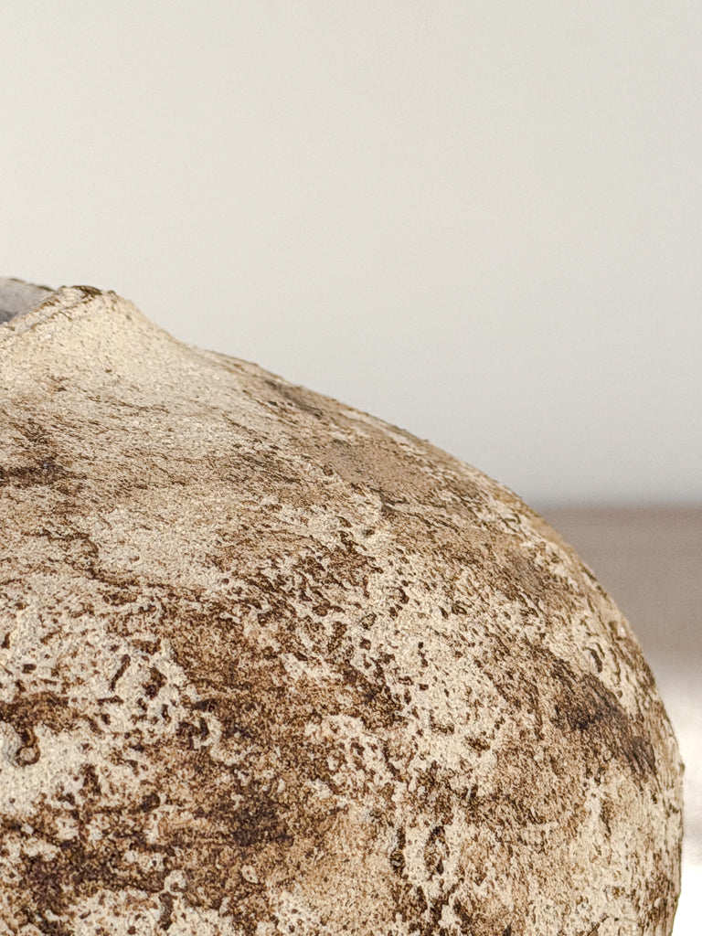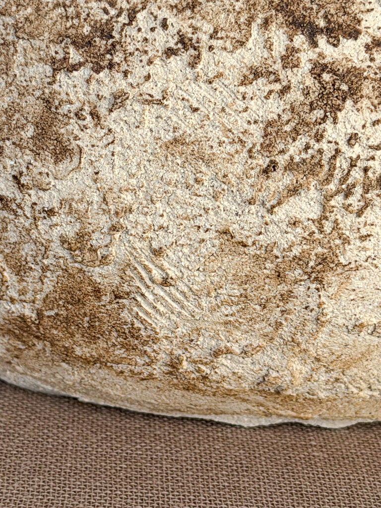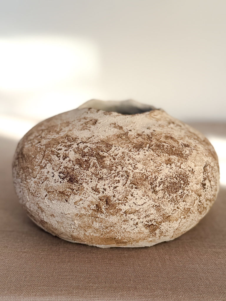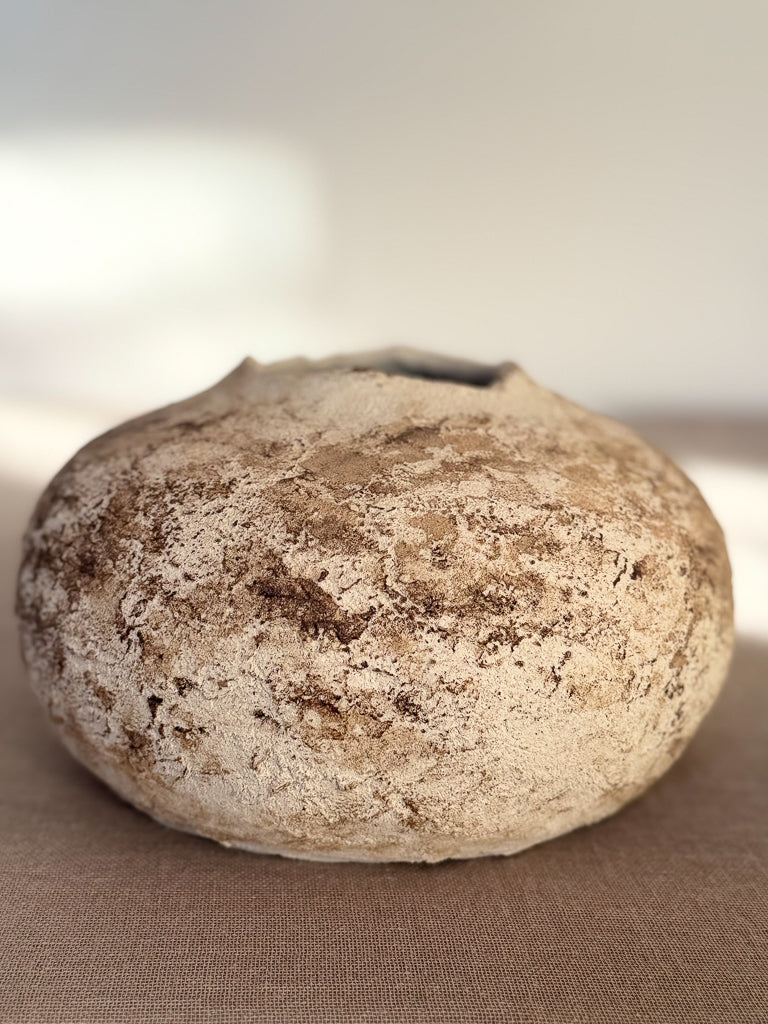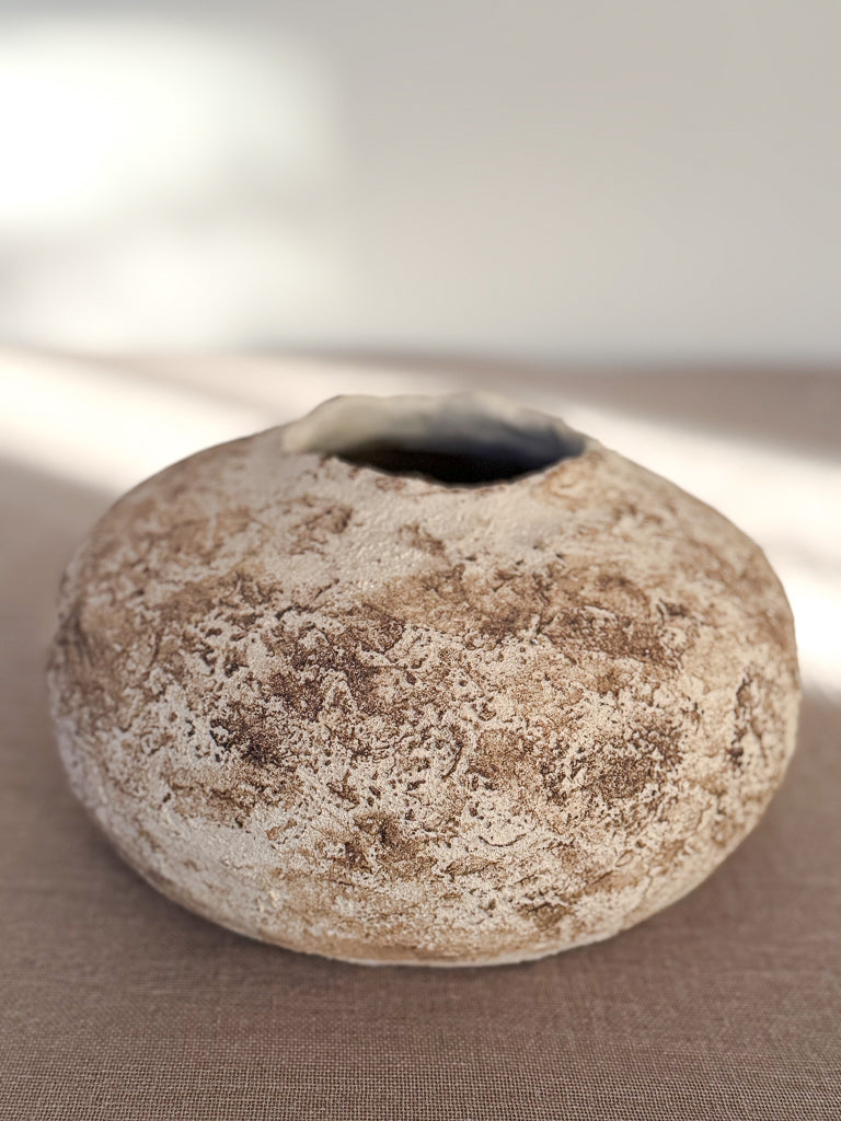 Cette forme ronde et organique semble émerger de la terre elle-même. Les parois portent des variations d'engobes créant une surface mouvante sur le grès chamotté. Le travail de texture est omniprésent – griffures, empreintes qui racontent le geste de construction. Le grès affleure par endroits, révélant la matière brute. Une pièce qui assume pleinement son caractère archaïque, ramassée et dense, comme un vestige qu'on aurait exhumé.